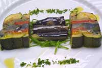 ズッキーニ なす トマト 玉葱 ピーマン レンズ豆 グリーンピースのテリーヌ ナスのマリネ サラダほうれん草添え