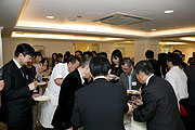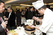 作り置きされて「乾杯」の発声とともにラップがはずされるオードブルは表面が乾きかけ、温かいものも冷たいものもいっせいに供されるから、ゲストの動線はぐちゃぐちゃ。飲みかけのグラスはすぐ迷子になっちゃって、鮨の屋台の前だけが長い行列。